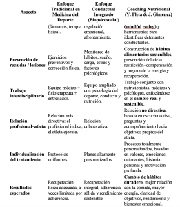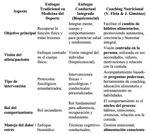 📊 Tabla Comparativa: Enfoque Tradicional vs Enfoque Conductual Integrado vs Coaching Nutricional (Fleta Y, Giménez J)